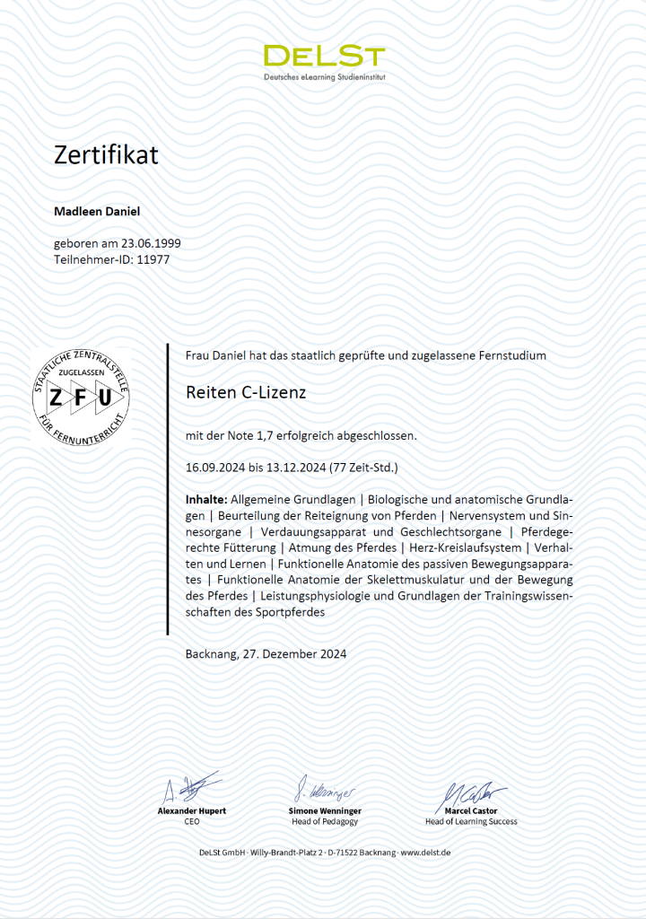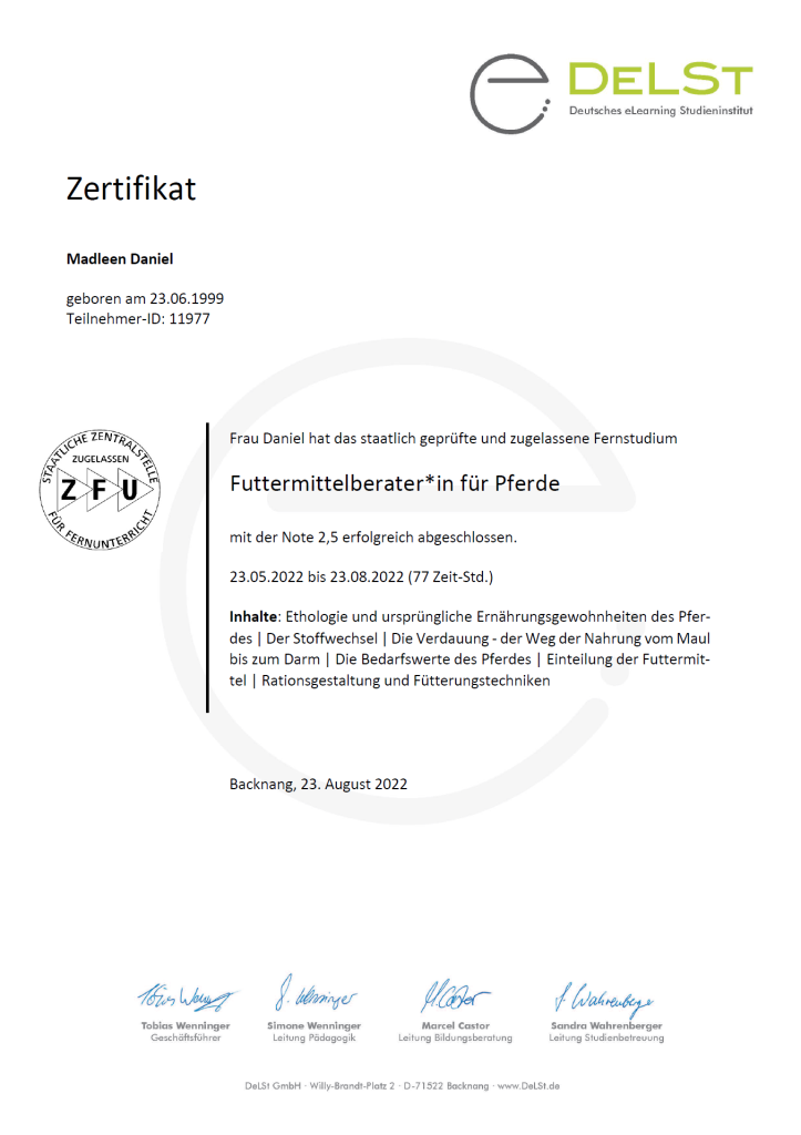 Durch meine Arbeit in verschiedenen Reitställen wurde mir schnell bewusst, wie entscheidend die richtige Fütterung für die Gesundheit und das Wohlbefinden von Pferden ist. Dieses wachsende Interesse hat mich dazu bewegt, eine Ausbildung zur Futterberaterin für Pferde zu absolvieren.