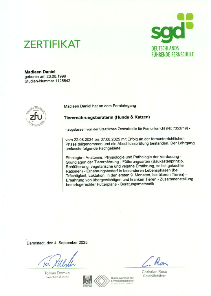 Aus diesem Grund habe ich mich entschieden, mein Wissen weiter zu vertiefen und zusätzlich die Ausbildung zur Ernährungsberaterin für Hunde und Katzen zu absolvieren. Heute liegt genau hier der Schwerpunkt meiner Arbeit.